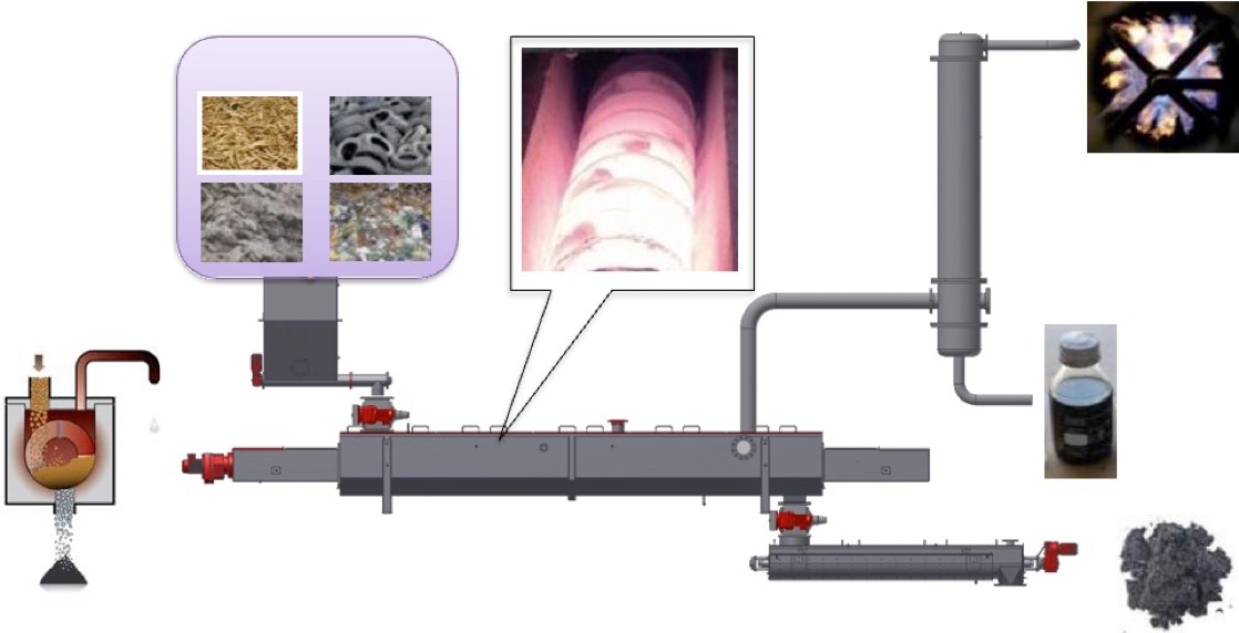1. Dry crumb is introduced in a hopper with regular and controlled flow. Particle size and moisture will affect the yield of biochar, oil and gas.